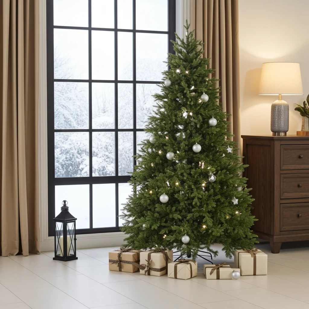 Искусственная новогодняя ель с густой, объемной кроной cветлого зеленого цвета. Выглядит ёлочка реалистично, натурально, ведь вся хвоя - литая. Веточки расположены равномерно объемно по всей длине почти до самого пола. Особенности модели: