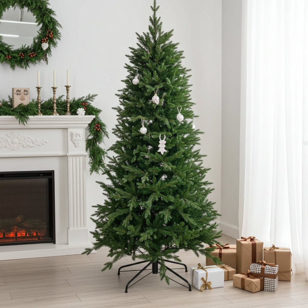 Благодаря шарнирному креплению веток установка занимает минимум времени, а литые лапки выглядят максимально натурально. Цвет хвои — насыщенно-зелёный с тонкой оранжево-коричневой прожилкой, что придаёт ели естественный и выразительный вид.