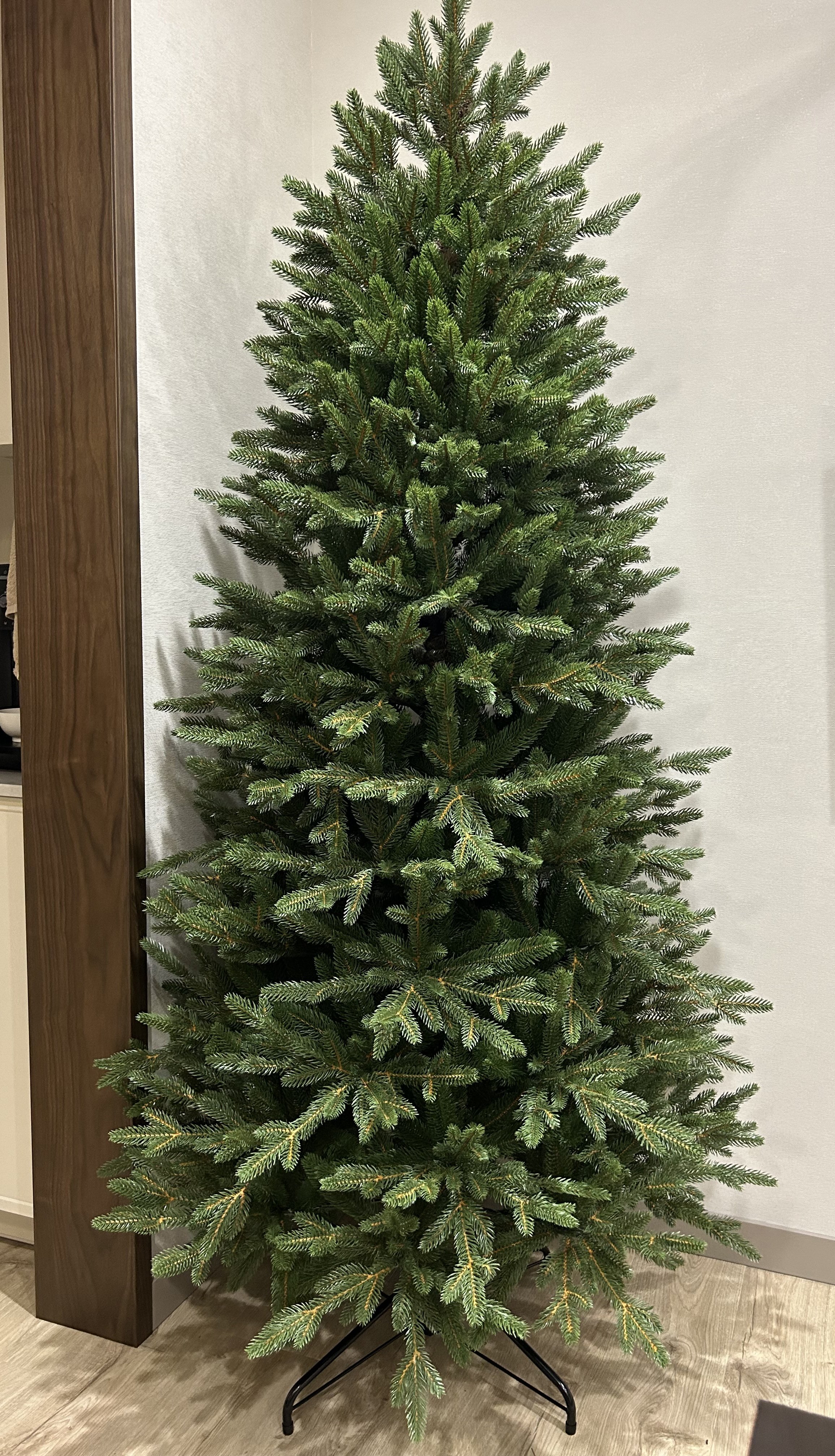 Главное преимущество этой модели — небольшой диаметр: ёлка не занимает много места, оставаясь при этом пушистой и аккуратной.